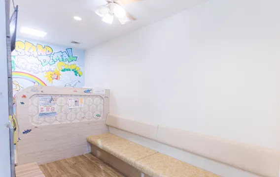 お子さまが楽しく過ごせる専用スペースをご用意。院内キャラクター「MEME(めめ)」と「MOMO(もも)」が壁に描かれ、通院を楽しい時間に変えてくれます。